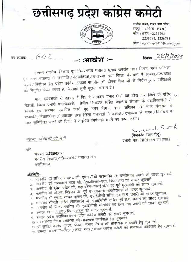 छत्तीसगढ़ प्रदेश कांग्रेस कमेटी ने नगरीय निकाय और पंचायत चुनावों के लिए पर्यवेक्षकों की नियुक्ति की