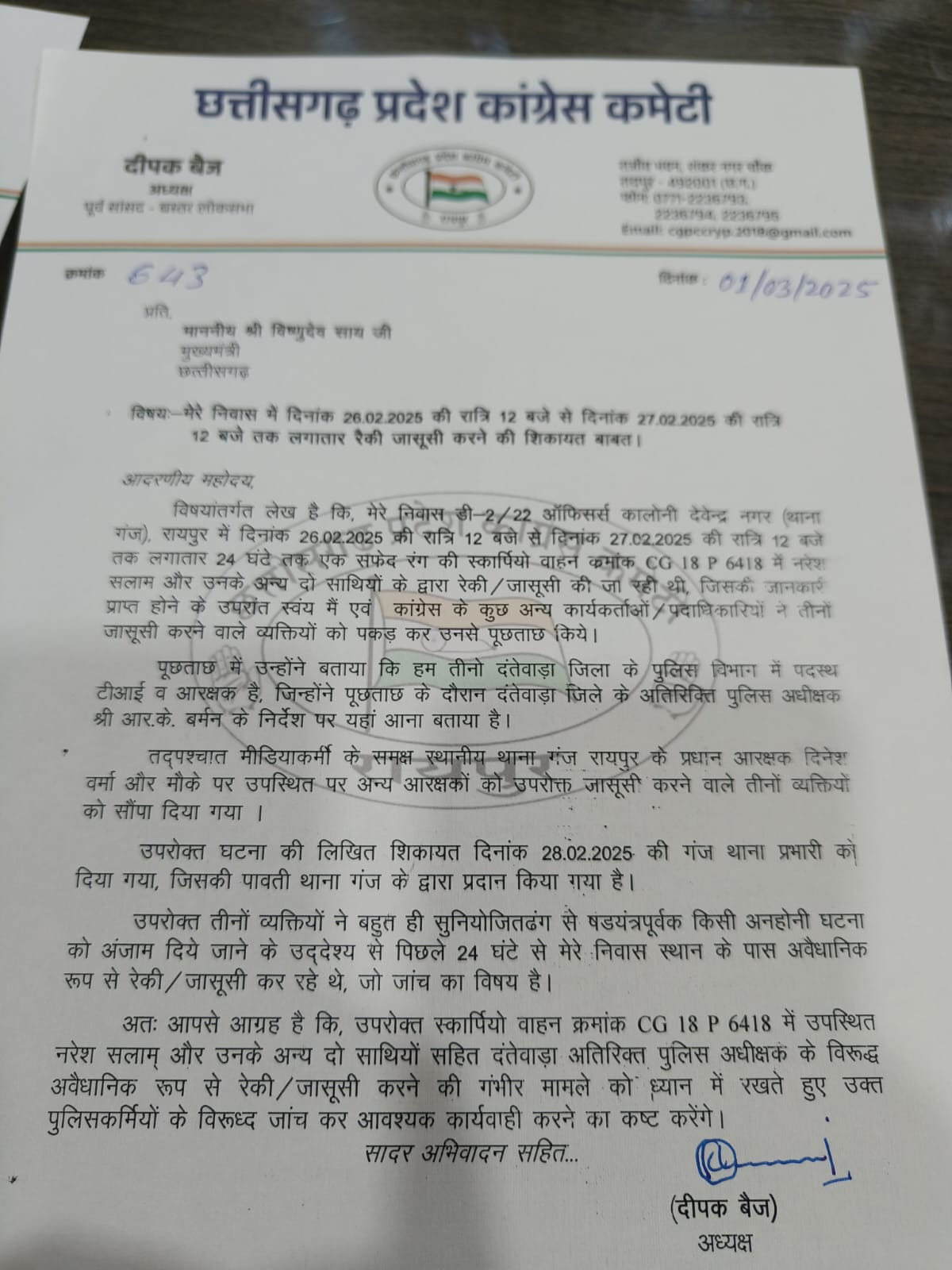 छत्तीसगढ़ कांग्रेस अध्यक्ष दीपक बैज के निवास की जासूसी का आरोप, पुलिसकर्मियों पर कार्रवाई की मांग