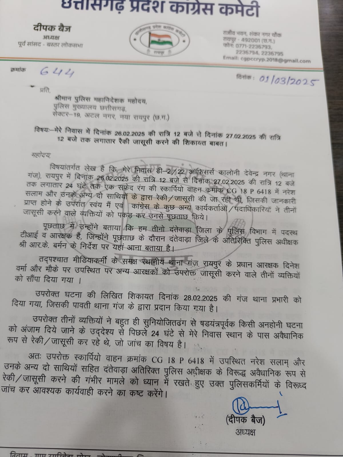 रायपुर, 1 मार्च 2025 – छत्तीसगढ़ प्रदेश कांग्रेस कमेटी के अध्यक्ष और बस्तर के पूर्व सांसद दीपक बैज ने अपने निवास की कथित रूप से 24 घंटे तक हुई जासूसी को लेकर प्रदेश के पुलिस महानिदेशक और मुख्यमंत्री को शिकायत पत्र सौंपा है। उन्होंने आरोप लगाया है कि 26 फरवरी की रात से 27 फरवरी की रात तक, रायपुर स्थित उनके निवास डी-2/22, ऑफिसर्स कॉलोनी, देवेंद्र नगर के बाहर एक सफेद स्कॉर्पियो (क्रमांक CG 18 P 6418) में बैठे तीन अज्ञात लोग लगातार रेकी कर रहे थे।