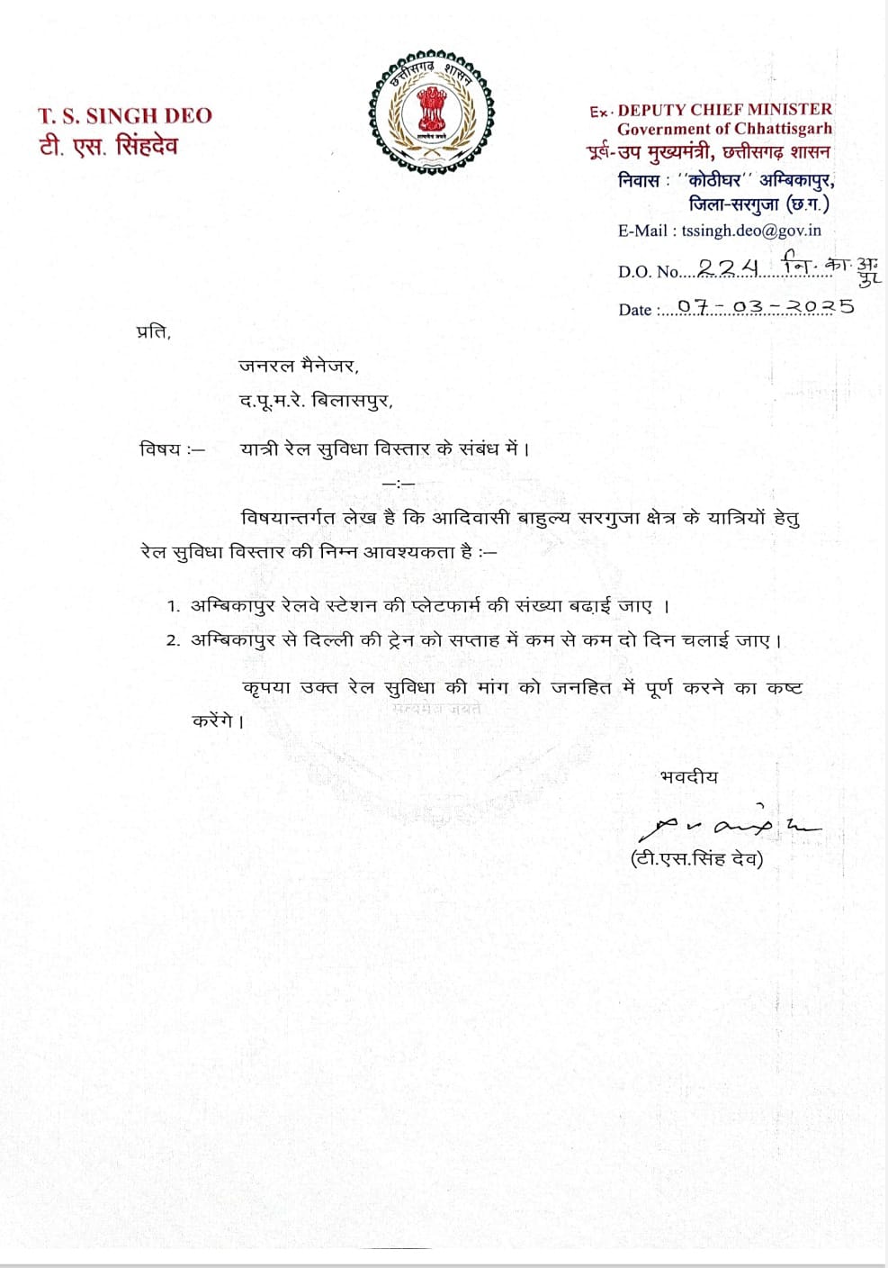 टी. एस. सिंहदेव ने इस मौके पर 31 दिसंबर 2024 को रेल मंत्री अश्विनी वैष्णव को भेजे गए मांग पत्र का उल्लेख करते हुए सरगुजा संभाग में रेलवे लाइन विस्तार और नई ट्रेनों की जरूरतों को प्रमुखता से उठाया।