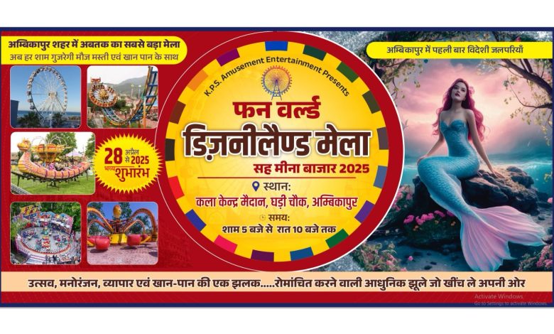 अम्बिकापुर में पहली बार विदेशी जलपरियों के साथ डिज़नीलैण्ड मेला सह मीना बाजार 2025 का भव्य शुभारंभ। जानें क्या-क्या है खास इस मेले में – आधुनिक झूले, खानपान, मनोरंजन और जनप्रतिनिधियों की उपस्थिति।
