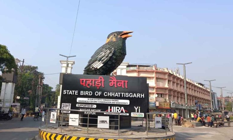 रायपुर। राजधानी में छत्तीसगढ़ के राजकीय पक्षी पहाड़ी मैना की विशाल प्रतिमा लोगों के आकर्षण का केंद्र बनी हुई है. संकटग्रस्त प्रजातियों में से एक पहाड़ी मैना को बचाने और पर्यावरण संरक्षण के प्रति जनजागरूकता लाने यंग इंडिया ग्रुप ने यह प्रयास किया है. शहर को सुंदर बनाने और शहर को सुंदर बनाने पर्यावरण के प्रति चेतना जगाने पहाड़ी मैना की सुंदर आकृति स्थापित की गई है. पहाड़ी मैना की प्रतिमा तैयार करने फैक्ट्री और घरों से निकलने वाली अनुपयोगी सामग्री का इस्तेमाल किया गया है. इसमें सरिया, गियर प्लेट, मशीनों के क्षतिग्रस्त हिस्से, लोहे की चेन, जाली, लोहे की प्लेट आदि का उपयोग किया गया है. नगर निगम रायपुर, हीरा ग्रुप और यंग इंडिया सहित कई संस्थाओं के सहयोग से सुंदर पहाड़ी मैना को तैयार किया गया है.