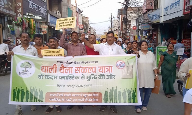 इस अवसर पर कार्यक्रम के संबंध में जानकारी देते हुए ग्रीन क्लब अंबिकापुर के संयोजक डॉ योगेन्द्र सिंह गहरवार ने बताया कि 5 जून 2025 को विश्व पर्यावरण दिवस है। इस बार पर्यावरण दिवस का थीम है “प्लास्टिक से मुक्ति की ओर..” इसी थीम के मद्देनजर विश्व पर्यावरण दिवस की पूर्व संध्या पर, हम सब मिलकर एक थाली-थैला संकल्प यात्रा का आयोजन कर रहे हैं। यह यात्रा केवल एक कदम नहीं है, यह एक संकल्प है, एक प्रतिज्ञा है कि हम अपने जीवन में प्लास्टिक का प्रयोग घटाएँगे। ग्रीन क्लब ,आरोग्य भारती और भारत विकास परिषद अंबिकापुर के इस भव्य आयोजन में भारत मे इंडियन मेडिकल एसोसिएशन, सुपरकिंग्स क्रिकेट टीम के खिलाड़ी, गायत्री परिवार, संस्कार भारती, राष्ट्रीय कवि संगम, नवा बिहान, नैशनल ह्यूमन राइट्स एंटी करप्शन ब्यूरो, लायंस क्लब, बंधन बैंक, एनसीसी, संगीत संघ, सेवा किटी समुह, वसुधा महिला मंच , सरगुजा सिने आर्ट एसोसिएशन, काव्य श्रृखंला, आर्ट ऑफ लिविंग, कैट के प्रतिनिधि, भारतीय जनता युवा मोर्चा, समाजसेवी वंदना दत्ता एवं सूजन बिंद , कई व्यवसाई , लेजर हॉस्पिटल के संचालक एवं कर्मचारी , भाजपा तथा कॉंग्रेस पार्टी के पदाधिकारी सदस्यों सहित ने बड़ी संख्या में भाग लिया। कार्यक्रम के घड़ी चौक में समापन से पूर्व गायत्री परिवार की बच्चियों ने नुक्कड़ नाटक के माध्यम से पर्यावरण जागरूकता व प्लास्टिक मुक्त धरती बनाने के लिए शानदार प्रस्तुति दी।