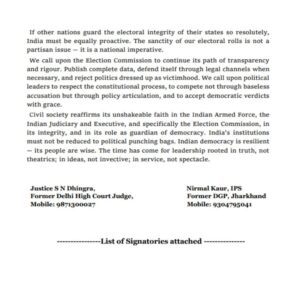 नई दिल्ली। चुनाव आयोग पर लगे “वोट चोरी” के आरोपों को लेकर देश में सियासी बहस तेज हो गई है। इसी बीच 16 पूर्व जजों, 123 सेवानिवृत्त ब्यूरोक्रेट्स (जिनमें 14 पूर्व राजदूत भी शामिल), और 133 रिटायर्ड सैन्य अधिकारियों—कुल 272 हस्ताक्षरकर्ताओं—ने कांग्रेस नेता राहुल गांधी के खिलाफ एक ओपन लेटर जारी किया है।