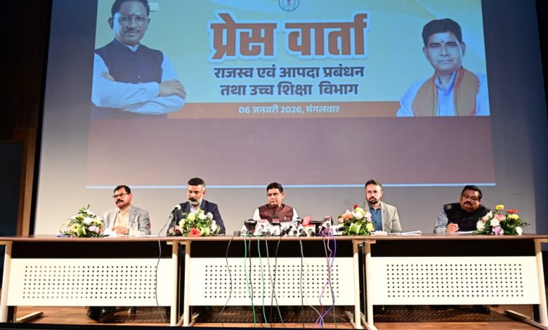 रायपुर | 06 जनवरी 2026 | छत्तीसगढ़ शासन के राजस्व एवं आपदा प्रबंधन तथा उच्च शिक्षा विभाग द्वारा पिछले दो वर्षों में किए गए कार्यों और आगामी कार्ययोजना को लेकर आज नवा रायपुर स्थित छत्तीसगढ़ संवाद ऑडिटोरियम में एक विस्तृत प्रेस वार्ता आयोजित की गई। प्रेस वार्ता को संबोधित करते हुए विभागीय मंत्री श्री टंक राम वर्मा ने कहा कि राज्य सरकार ने प्रशासनिक पारदर्शिता, जनहित और विकास को केंद्र में रखकर कई ऐतिहासिक निर्णय लिए हैं, जिनका लाभ सीधे आम जनता तक पहुंच रहा है।