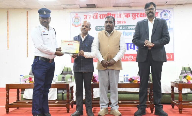 बलरामपुर जिले में 37वें राष्ट्रीय सड़क सुरक्षा माह 2026 का समापन ऑडिटोरियम हॉल में हुआ। कलेक्टर राजेन्द्र कटारा और एसपी वैभव बैंकर की मौजूदगी में सड़क सुरक्षा जागरूकता कार्यक्रमों, रील्स प्रतियोगिता और ‘नो हेलमेट-नो पेट्रोल’ अभियान के प्रतिभागियों को सम्मानित किया गया।