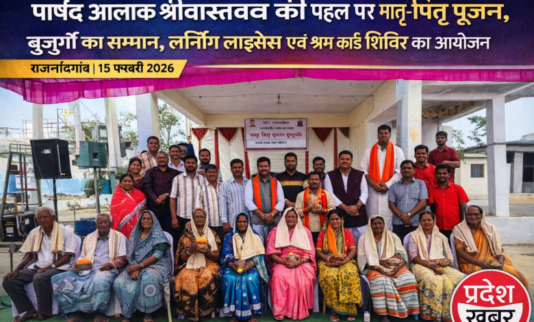 राजनांदगांव के मोहारा वार्ड में पार्षद आलोक श्रोती की पहल पर मातृ-पितृ पूजन, बुजुर्ग सम्मान समारोह, लर्निंग लाइसेंस एवं श्रम कार्ड शिविर का सफल आयोजन, बड़ी संख्या में लोग हुए शामिल।