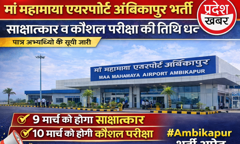 मां महामाया एयरपोर्ट अंबिकापुर भर्ती: साक्षात्कार व कौशल परीक्षा की तिथि घोषित, पात्र अभ्यर्थियों की सूची जारी