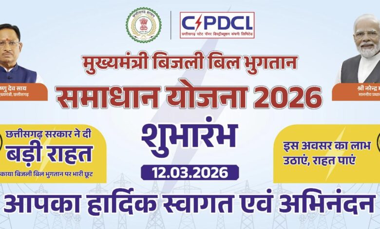 मुख्यमंत्री विष्णुदेव साय ने बिजली बिल भुगतान समाधान योजना 2026 शुरू की। बीपीएल, घरेलू और कृषि उपभोक्ताओं को बकाया बिल पर 75% तक छूट और अधिभार पूरी तरह माफ।