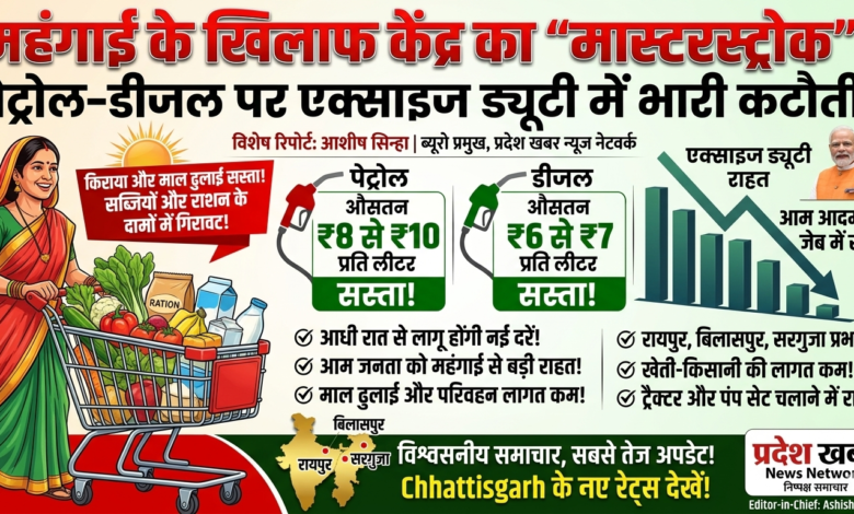 केंद्र सरकार का बड़ा फैसला: पेट्रोल और डीजल पर एक्साइज ड्यूटी में भारी कटौती। आम जनता को महंगाई से मिलेगी बड़ी राहत। छत्तीसगढ़ सहित पूरे देश में घटेंगे दाम।