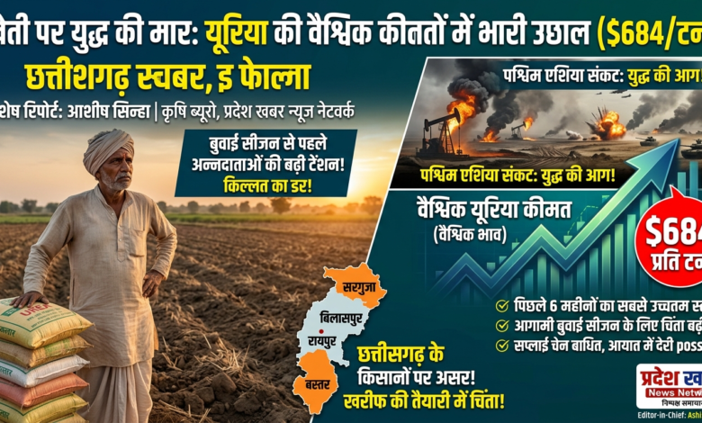 नई दिल्ली/रायपुर: पश्चिम एशिया में गहराते युद्ध के बादलों का सीधा असर अब भारतीय किसानों की रसोई और खेतों तक पहुँचता दिख रहा है। अंतरराष्ट्रीय बाजार में **यूरिया की कीमतों में जबरदस्त उछाल** आया है। सप्लाई चेन बाधित होने के कारण यूरिया का भाव **$684 प्रति टन** के पार पहुँच गया है, जिससे आगामी बुवाई सीजन को लेकर देशभर के किसानों और सरकार की चिंताएं बढ़ गई हैं।