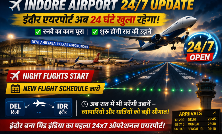 इंदौरवासियों के लिए खुशखबरी! देवी अहिल्याबाई होलकर एयरपोर्ट अब 24 घंटे संचालित होगा। रनवे की मरम्मत पूरी होने के बाद रात की उड़ानों (Night Flights) के लिए रास्ते खुल गए हैं। समय की बचत और सस्ता किराया—जानें पूरी रिपोर्ट।