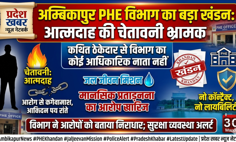 अम्बिकापुर: लोक स्वास्थ्य यांत्रिकी विभाग (PHE) खंड अम्बिकापुर में पिछले कुछ दिनों से सोशल मीडिया और पत्रों के माध्यम से प्रसारित हो रही एक कथित प्रेस विज्ञप्ति और आत्मदाह की चेतावनी पर विभाग ने अपना आधिकारिक रुख स्पष्ट कर दिया है। विभाग ने इस पूरे मामले को भ्रामक बताते हुए कहा है कि जिस व्यक्ति ने आत्मदाह की चेतावनी दी है, उसका विभाग के साथ कोई भी आधिकारिक अनुबंध (Contract) पंजीकृत नहीं है।