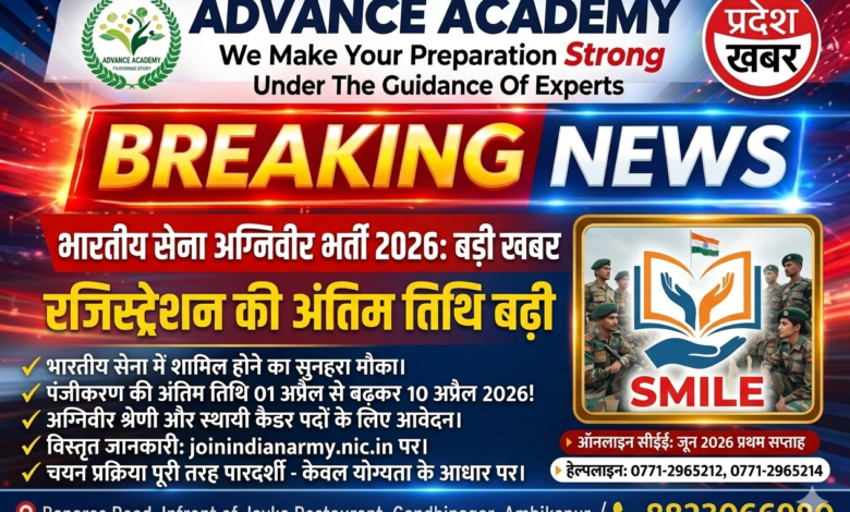 सेना भर्ती कार्यालय रायपुर ने अग्निवीर और स्थायी कैडर पदों के लिए ऑनलाइन पंजीकरण की अंतिम तिथि 10 अप्रैल 2026 तक बढ़ा दी है। बलरामपुर और छत्तीसगढ़ के युवा अब इस बढ़ी हुई तारीख तक आवेदन कर सकते हैं। पूरी जानकारी यहाँ पढ़ें।