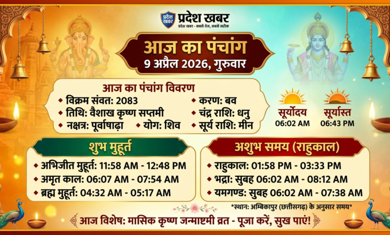 Aaj Ka Panchang, 9 April 2026: सनातन धर्म में पंचांग का विशेष महत्व है। किसी भी शुभ कार्य को करने से पहले तिथि, नक्षत्र और शुभ मुहूर्त का विचार करना आवश्यक माना गया है। आज 9 अप्रैल 2026, गुरुवार का दिन है। आज वैशाख मास के कृष्ण पक्ष की सप्तमी तिथि है जो रात तक रहेगी, जिसके बाद अष्टमी का प्रारंभ होगा। आज विशेष रूप से मासिक कृष्ण जन्माष्टमी का व्रत भी रखा जाएगा।