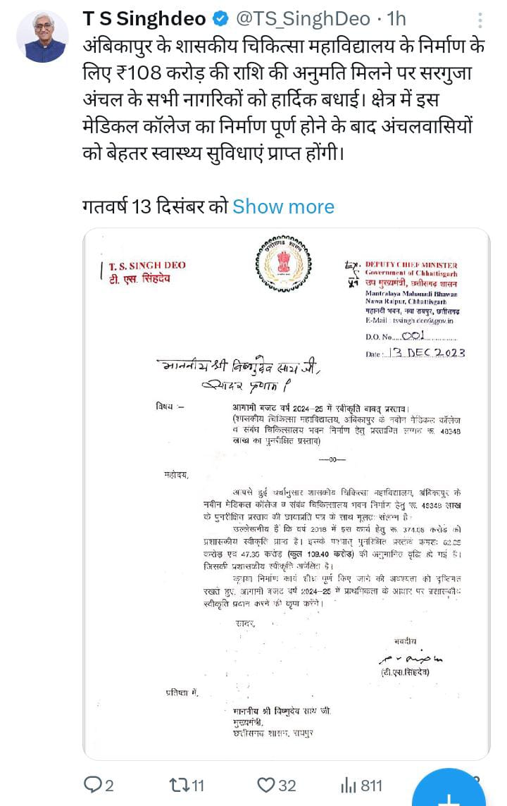 टी.एस. सिंह देव ने अंबिकापुर के शा. चि. महा. के निर्माण के लिए ₹108 करोड़ की अनुमति मिलने पर हार्दिक बधाई दी।
