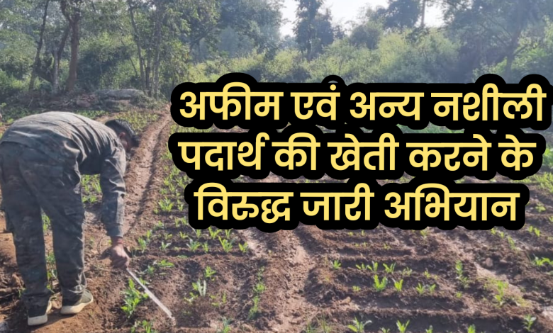 राॅंची//वरीय पुलिस अधीक्षक,रांची के निर्देशानुसार अफीम एवं अन्य नशीली पदार्थ की खेती करने के विरुद्ध जारी अभियान चलाया गया। दशमफाॅल थानाक्षेत्र अंतर्गत ग्राम मुर्गीडीह के आसपास के जंगली क्षेत्र में लगे अफीम के बीज लगे लगभग दो एकड़ खेत को ट्रैक्टर से जोत कर एवं पुलिस बल के मदद से विनष्ट किया गया। इसके अलावा बुंडू थाना अंतर्गत ऐदलहातू ग्राम क्षेत्र में लगभग एक एकड़ में लगे अफीम के पौधे को नष्ट किया गया।
