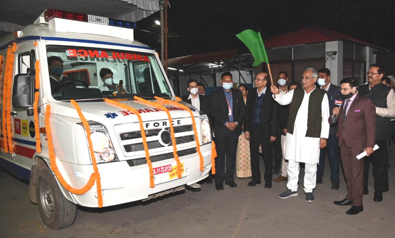 रायपुर, 03 जनवरी 2022मुख्यमंत्री भूपेश बघेल ने आज शाम राजधानी स्थित अपने निवास कार्यालय परिसर से सभी सुविधाओं एवं उपकरणों से सुसज्जित दो नग एम्बुलेंस को हरी झण्डी दिखाकर रवाना किया। गोयल गु्रप ऑफ इंडस्ट्रीज द्वारा अपने सामाजिक दायित्व निर्वहन के तहत प्रदत्त दोनों एम्बुलेंस में से एक एम्बुलंेस उपाध्याय हॉस्पिटल रायपुर तथा एक एम्बुलेंस उत्तर बस्तर (कांकेर) जिले के अंतर्गत सामुदायिक स्वास्थ्य केन्द्र भानुप्रतापपुर को प्रदाय किए गए हैं। एम्बुलेंस का उपयोग दोनों अस्पतालों द्वारा अपने आसपास के क्षेत्रों में लोगों की सुविधा के लिए किया जाएगा।