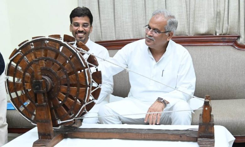 मुख्यमंत्री को रायपुर के व्यवसायी श्री कोठारीे ने आत्मीय भाव से भेंट किया 65 साल पुराना गांधी चरखा