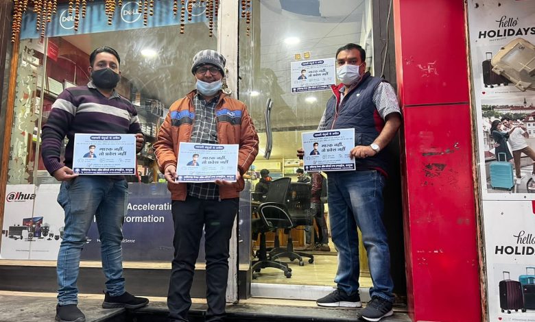 आज दिनांक 15/01/2022 को छत्तीसगढ़ चैम्बर आफ कामर्स एण्ड इंडस्ट्रीज, सरगुजा इकाई द्वारा “मास्क नहीं तो प्रवेश नहीं” मुहिम का आगाज़ ब्रह्म रोड, अम्बिकापुर से किया गया। सरगुजा इकाई के अध्यक्ष अजीत अग्रवाल, उपाध्यक्ष गुलाब चंद धनवानी एवं कोषाध्यक्ष अमित तिवारी द्वारा सभी दुकानों मे जा कर “मास्क नहीं तो प्रवेश नहीं” के स्टीकर लगाए गए एवं व्यापारियों को कोरोना से सम्बंधित समस्त प्रोटोकॉल फालो करने हेतू निवेदन किया गया ताकि सम्पूर्ण जिले को लाकडाउन जैसी विषम परिस्थिति का सामना पुनः करने से बचाया जा सके। चैम्बर के सदस्यों द्वारा सभी दुकानदारों से उनके परिवार व स्टाफ के वैक्सिनेशन की जानकारी भी ली गई। साथ ही दुकानों मे मौजूद ग्राहकों को भी कोरोना से बचाव हेतु मास्क लगाने, सैनेटाइजर का लगातार प्रयोग करने और सोशल डिस्टेंस का पालन आवश्यक रूप से स्वयं करने एवं अन्य लोगों को प्रेरित करने के लिए निवेदन किया गया।