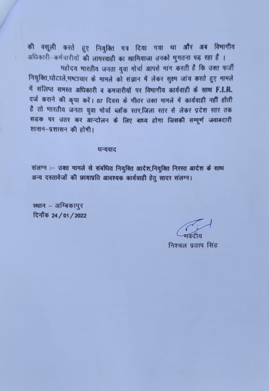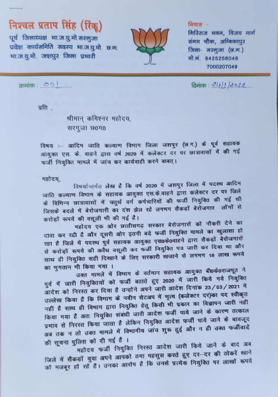 जशपुर जिले मे सहायक आयुक्त (आदिवासी विभाग )द्वारा कलेक्टर दर मे चतुर्थ श्रेणी मे हुई फर्जी नियुक्ति को लेकर सरगुजा संभाग आयुक्त को ज्ञापन ।