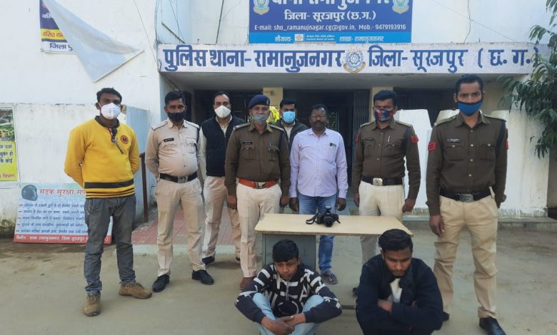 छप्पर तोड़कर दुकान से चोरी करने वाले 2 गिरफ्तार, रामानुजनगर पुलिस की कार्यवाही।