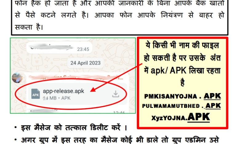 गोपाल सिंह विद्रोही //बिश्रामपुर// सूरजपुर – सुरजपुर पुलिस ने व्हाट्सएप पर इन दिनों आ रहे मैसेज से जिसमें अचानक फाइल रहती है उसके आखिर में apk/APK लिखा रहता है उसे क्लिक न करने की अपील करते हुए कहा है कि आम जनों का इससे फोन हैक हो जाता है और आपकी जानकारी के बिना आपके बैंक खातों से पैसे कटने लगते हैं ।आपका फोन आपके नियंत्रण से बाहर हो सकता है। पुलिस ने आम लोगों से अपील करते हुए एक विशेष पोस्टर एवं पंपलेट जारी किया है जिसमें कहा गया है कि कि प्रत्येक व्यक्ति मैसेज से सावधान रहें एवं अन्य लोगों को भी जागृत करें तथा इस मैसेज को तत्काल डिलीट करें!