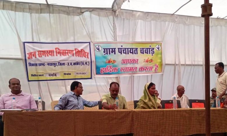 उत्तर बस्तर कांकेर/ कलेक्टर निलेश कुमार महादेव क्षीरसागर के निर्देशानुसार नरहरपुर विकासखण्ड के ग्राम चंवाड़ में आज ब्लॉक स्तरीय जनसमस्या निवारण शिविर का आयोजन किया गया, जहां पर कुल 42 आवेदन प्राप्त हुए। जनपद पंचायत के सीईओ से प्राप्त जानकारी के अनुसार जिले के आम नागरिकों की आवश्यकताओं, शिकायतों एवं समस्याओं का समाधान के लिए जिला एवं जनपद स्तरीय जनसमस्या निवारण शिविर का आयोजन किया जा रहा है। ग्राम चंवाड़ में आयोजित शिविर में मुख्य रूप से पंचायत एवं ग्रामीण विकास विभाग को 14, खाद्य एवं नागरिक आपूर्ति विभाग के 11 तथा समाज कल्याण विभाग के 05 आवेदन प्राप्त हुए, जिनका यथासंभव निराकरण किया गया।