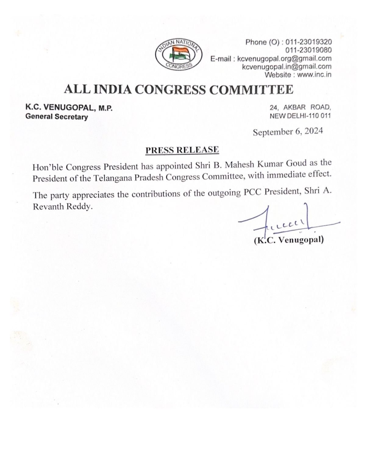 पार्टी निवर्तमान पीसीसी अध्यक्ष ए रेवंत रेड्डी के योगदान की प्रशंसा करती है। तेलंगाना के मुख्यमंत्री रेवंत रेड्डी और उपमुख्यमंत्री भट्टी विक्रमार्क मल्लू के साथ कांग्रेस अध्यक्ष खरगे की बैठक और राज्य में संगठनात्मक बदलावों पर चर्चा करने के कुछ दिनों बाद यह नियुक्ति हुई है।