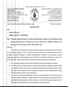 इस संबंध में विधायक शैलेष पांडेय ने एसईसीएल अध्यक्ष सह प्रबंध निदेशक को बीते 24 अप्रैल को पत्र लिखा था। जिसमें बिलासपुर में कोरोना महामारी के तेजी से फैलने का जिक्र करते हुए ऑक्सीजन सिलेंडर की कमी और गरीब, जरूरतमंद लोगों की मदद के लिए 25 लाख रुपए की सहायता प्रदान करने की मांग की थी. एसईसीएल प्रबंधन ने विधायक शैलेष पांडेय की बात को गंभीरता से लेते हुए महज चार दिनों के भीतर सीएसआर मद से ऑक्सीजन सिलेंडर क्रय करने के लिए बिलासपुर कलेक्टर को 25 लाख रुपए की सहायता प्रदान की है. इसके लिए विधायक ने एसईसीएल प्रबंधन का धन्यवाद दिया है।