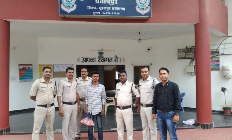 गोपाल सिंह विद्रोही बिश्रामपुर-सूरजपुर -पुलिस अधीक्षक रामकृष्ण साहू के निर्देश के बाद अवैध कारोबारियों के विरूद्ध पुलिस की निरंतर कार्यवाही जारी है। इसी क्रम में बीते शनिवार को थाना प्रतापपुर पुलिस ने मुखबिर की सूचना पर ग्राम खोरमा में घेराबंदी कर इरफान खान पिता स्वर्गीय मोहम्मद सनवर खान उम्र 22 वर्ष निवासी प्रतापपुर को पकड़ा जिसके कब्जे से नशीली कफ सिरप ऑनरेक्स 20 नग जफ्त किया गया जिसकी बाजार कीमत करीब ₹3000 है। मामले में आरोपी के विरूद्व धारा 21(सी) एनडीपीएस एक्ट के तहत कार्यवाही कर गिरफ्तार किया गया। इस कार्यवाही में थाना प्रभारी प्रतापपुर लक्ष्मण सिंह धुर्वे, एसआई नवल किशोर दुबे, प्रधान आरक्षक राजेश यादव, मनोज केरकेट्टा, आरक्षक इंद्रजीत सिंह, अरविंद पांडे, अनिल, अवधेश कुशवाहा व प्रवीण सिंह सक्रिय रहे।