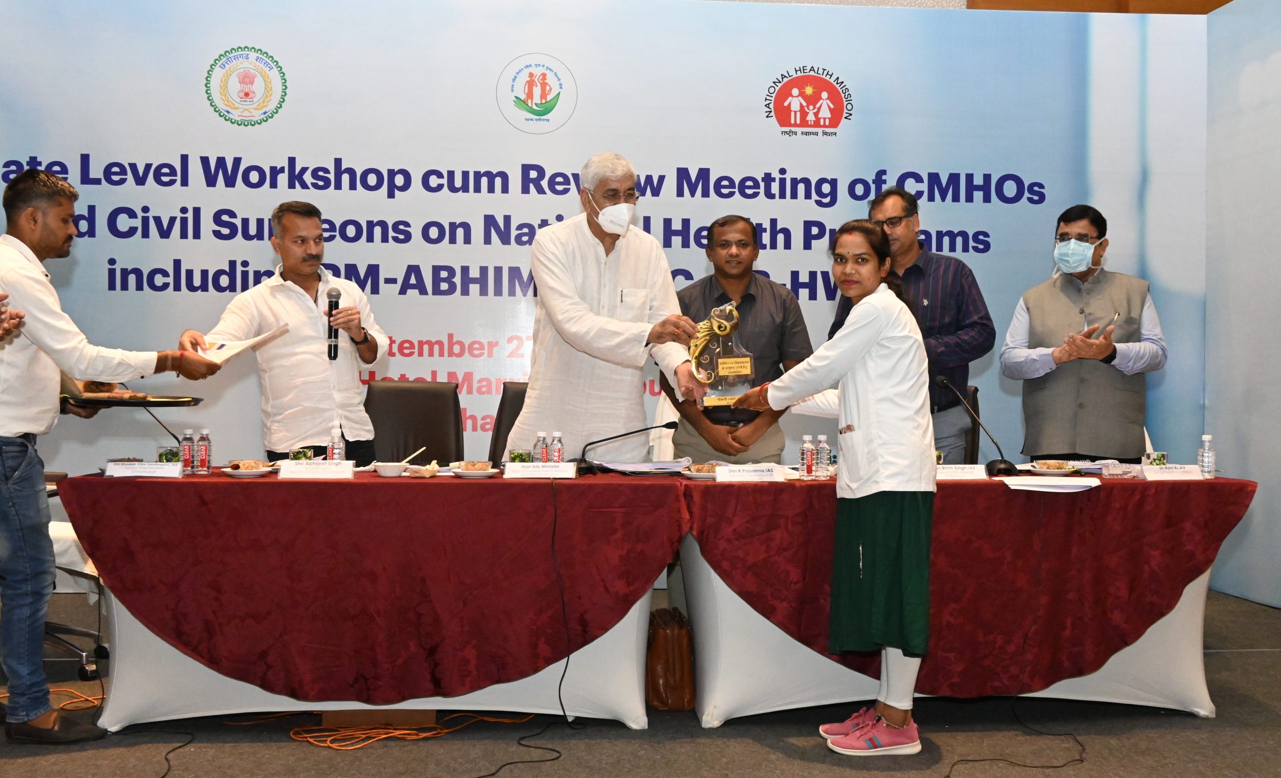 स्वास्थ्य मंत्री ने बैठक में कोविड वैक्सीनेशन में उल्लेखनीय योगदान के लिए बीजापुर जिले के उसूर सामुदायिक स्वास्थ्य केंद्र के तीन स्वास्थ्य अधिकारी (त्भ्व्) श्रीमती ज्योति सिदार, श्रीमती नागमणी चिलमुल और श्री रमेश गड्डेम को प्रशस्ति पत्र एवं शाल भेंट कर सम्मानित किया। इन तीनों स्वास्थ्य योद्धाओं ने कोविड वैक्सीनेशन के लिए घुटने तक पानी से भरे तीन नदियों को पैदल पार कर ग्राम मारूड़बाका पहुंच लोगों का वैक्सीनेशन किया था।