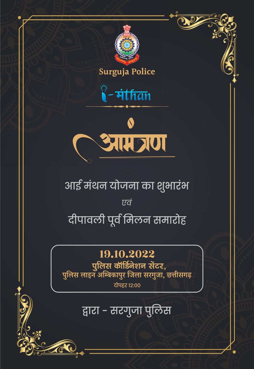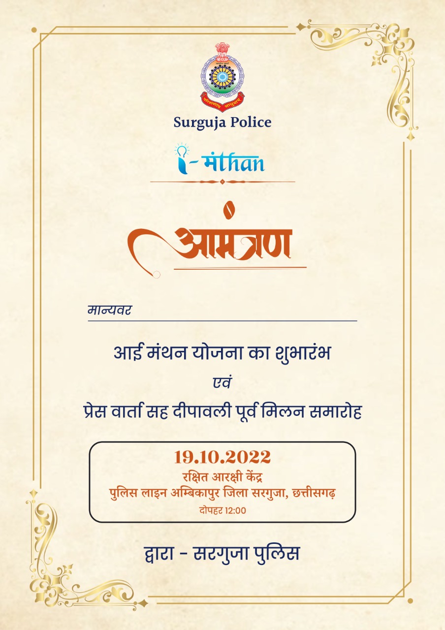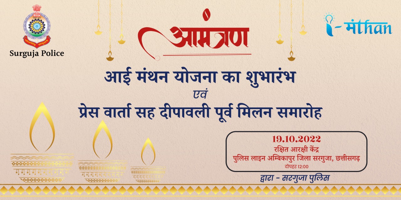 पुलिस महानिरीक्षक सरगुजा रेंज अजय यादव (भा.पु.से.) के गरिमामई उपस्थिति मे पुलिस अधीक्षक सरगुजा श्रीमती भावना गुप्ता (भा.पु.से ) के निर्देशन में कल दिनांक 19/10/ 2022 दिन बुधवार को 12:00 बजे पुलिस को ऑर्डिनेशन सेंटर में आई मंथन योजना, समर्पण अभियान, प्रेस वार्ता सह दीपावली पूर्व मिलन समारोह एवं सुरुचि भोज आयोजित किया गया है, आप सभी प्रिंट मीडिया एवं इलेक्ट्रॉनिक मीडिया के सम्मानित सदस्य कार्यक्रम में सादर आमंत्रित हैं