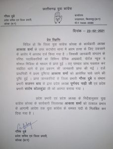 कोरबा: युवा कांग्रेस कार्यकारी जिलाध्यक्ष आकाश शर्मा को सभी पदों से किया गया निलंबित
