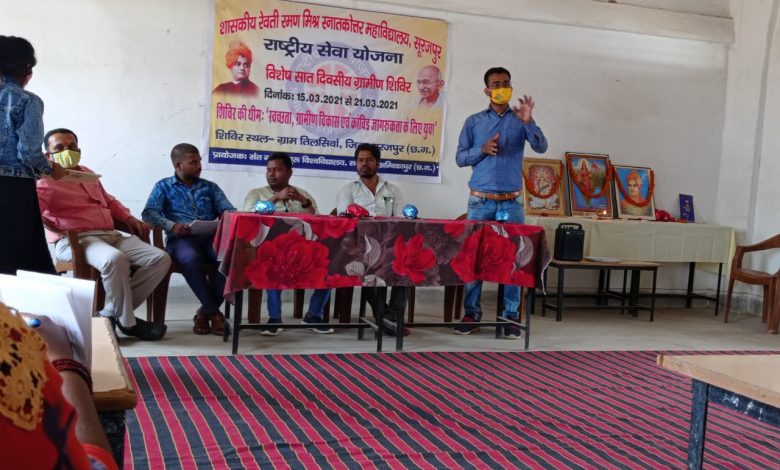 जानकारी के अनुसार डी. ए. वी. स्कूल तिलसिवां परिसर में गुरु संत गाहिरा विश्वविद्यालय, सरगुजा के अंतर्गत रेवती रमन मिश्र स्नातकोत्तर महाविद्यालय, सूरजपुर के प्राध्यापक सी. बी. मिश्रा के मार्गदर्शन में महाविद्यालय के 45 छात्र-छात्राओं का राष्ट्रीय सेवा योजना अंतर्गत 15.मार्च से 21.मार्च तक सात दिवसीय ग्रामीण शिविर का आयोजन किया गया है, जिसका थीम : स्वच्छता, ग्रामीण विकास व कोविड जागरूकता के लिए युवा है।