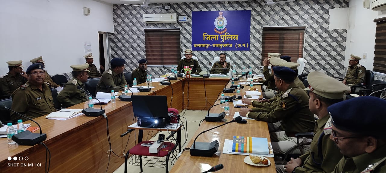 रक्षित केंद्र बलरामपुर में परेड निरीक्षण बाद आईजी सरगुजा द्वारा पुलिस अधीक्षक कार्यालय के सभाकक्ष में मोहित गर्ग पुलिस अधीक्षक बलरामपुर की मौजूदगी में जिले के सभी थाना-चौकी प्रभारियों की बैठक ली गई एवं जो अधिकारी बैठक में उपस्थित नहीं थे उन्हें वर्चुअली मीटिंग में जोड़कर बैठक में शामिल किया गया। बैठक में सर्वप्रथम पुलिस अधीक्षक बलरामपुर ने आईजी सरगुजा को जिले की सामान्य जानकारी से अवगत कराया। तत्पश्चात पुलिस महानिरीक्षक सरगुजा द्वारा बारी-बारी से समस्त थाना चौकी प्रभारीयों से उनके थानों में पुराने लंबित अपराध, मर्ग, शिकायत जांच के बारे में जानकारी प्राप्त की गई तथा पुराने प्रकरणों का जल्द से जल्द निराकरण करने एवं थाना चौकी में प्राप्त फरियाद सूचना रिपोर्ट पर बिना विलंब किए तत्परता के साथ यथोचित कार्यवाही सुनिश्चित करने तथा बैंक एवं वित्तीय संस्थानों में सुरक्षा के दृष्टिकोण से सतत निगाह रखने तथा नियमित रुप से गश्त पेट्रोलिंग करने तथा थाना चौकी में अभिलेख को उत्तम तरीके से रखने, स्थाई वारंटी को अधिक से अधिक तामिली अभियान चलाकर करने, आम जनता के मध्य पुलिस की स्वच्छ होनी चाहिए, अवैध मादक पदार्थों का परिवहन किसी भी प्रकार से नहीं हो, सूचना प्राप्त होने पर तत्काल पुलिस मौके पर पहुंचे कहा गया। बैठक में आईजी राम गोपाल गर्ग (भा.पु.से.) ने थाना-चौकी प्रभारियों का परिचय लेते हुए थाना क्षेत्र की भौगोलिक स्थिति, थाना-चौकी में तैनात बल, लंबित मामलों की जानकारी लेते हुए उसे समयावधि में निराकृत करने के निर्देश दिए।