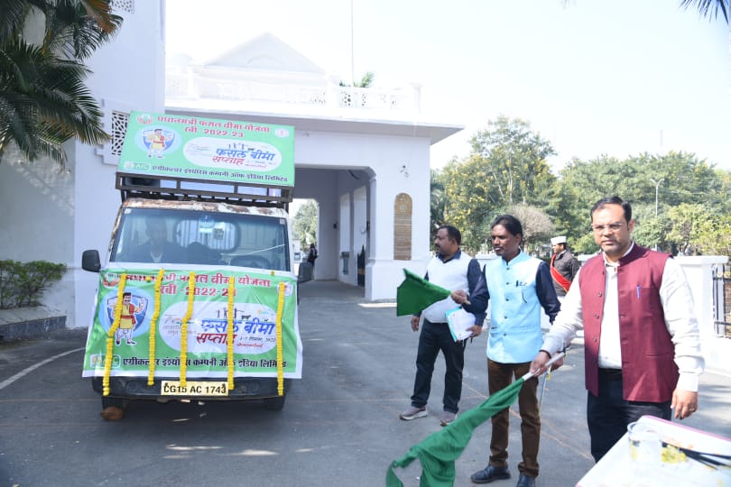 अम्बिकापुर 1 दिसम्बर 2022/ कलेक्टर कुन्दन कुमार एवं कृषि विभाग के अधिकारियों ने गुरुवार को कलेक्टोरेट परिसर से बीमा रथ को हरी झंडी दिखाकर रवाना किया।