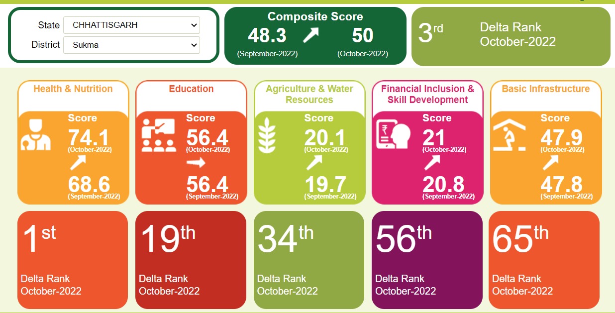 जिला प्रशासन द्वारा जिले में स्वास्थ्य, पोषण, शिक्षा, कृषि, मूलभूत सुविधाओं के विकास, कौशल विकास, जल संसाधन के क्षेत्र में बेहतर कार्य किया गया है। जिसके परिणाम स्वरूप नीति आयोग द्वारा जारी आंकड़ों के आधार पर अक्टूबर माह के ओवरऑल रेंक में सुकमा जिला को तीसरा स्थान मिला है, जो कि जिले में स्वास्थ्य, पोषण, शिक्षा के साथ ही अन्य क्षेत्रों में भी किए जा रहे बेहतर प्रदर्शन को दर्शाता है और सुकमा जिलेवासी इससे लाभांवित हो रहे हैं।