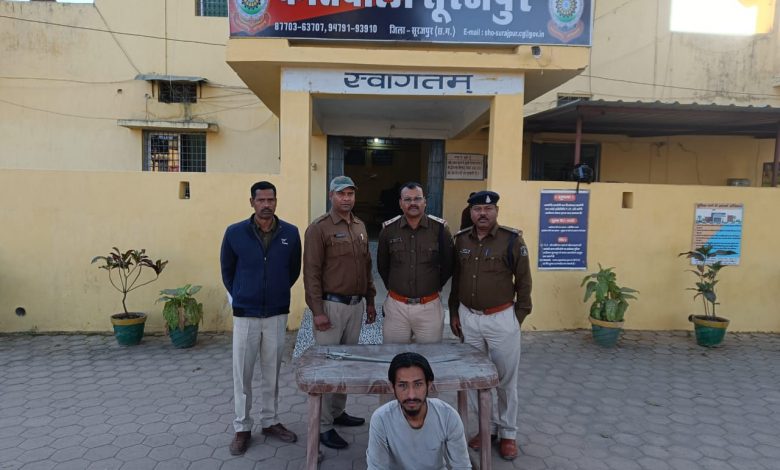 आर्म्स एक्ट की कार्यवाही। तलवार का भय दिखाकर लोगों को डरा धमका रहे 1 व्यक्ति को थाना सूरजपुर पुलिस ने किया गिरफ्तार।