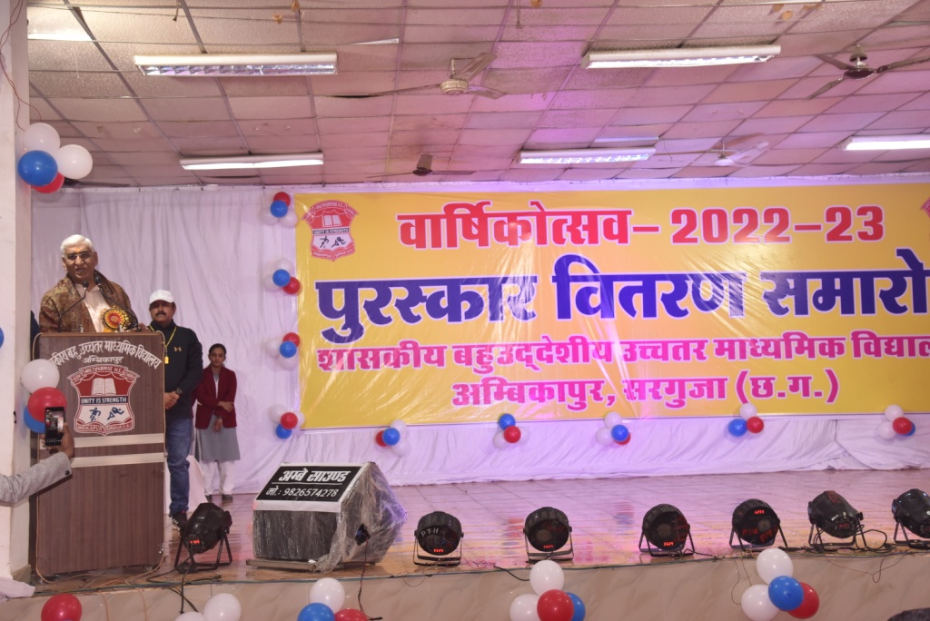 अम्बिकापुर 10 जनवरी 2023/ छत्तीसगढ़ शासन के स्वास्थ्य एवं परिवार कल्याण मंत्री टीएस सिंहदेव की मुख्य आतिथ्य में मंगलवार को शासकीय बहुउद्देशीय उच्चतर माध्यमिक विद्यालय अम्बिकापुर का वार्षिकोत्सव समारोह संपन्न हुआ। समारोह में छात्र-छात्राओं के द्वारा मनमोहक सांस्कृतिक कार्यक्रम प्रस्तुत किया गया। इस अवसर पर विभिन्न प्रतियोगिता के विजेता छात्रों को अतिथियों के द्वारा पुरस्कार प्रदान किया गया।