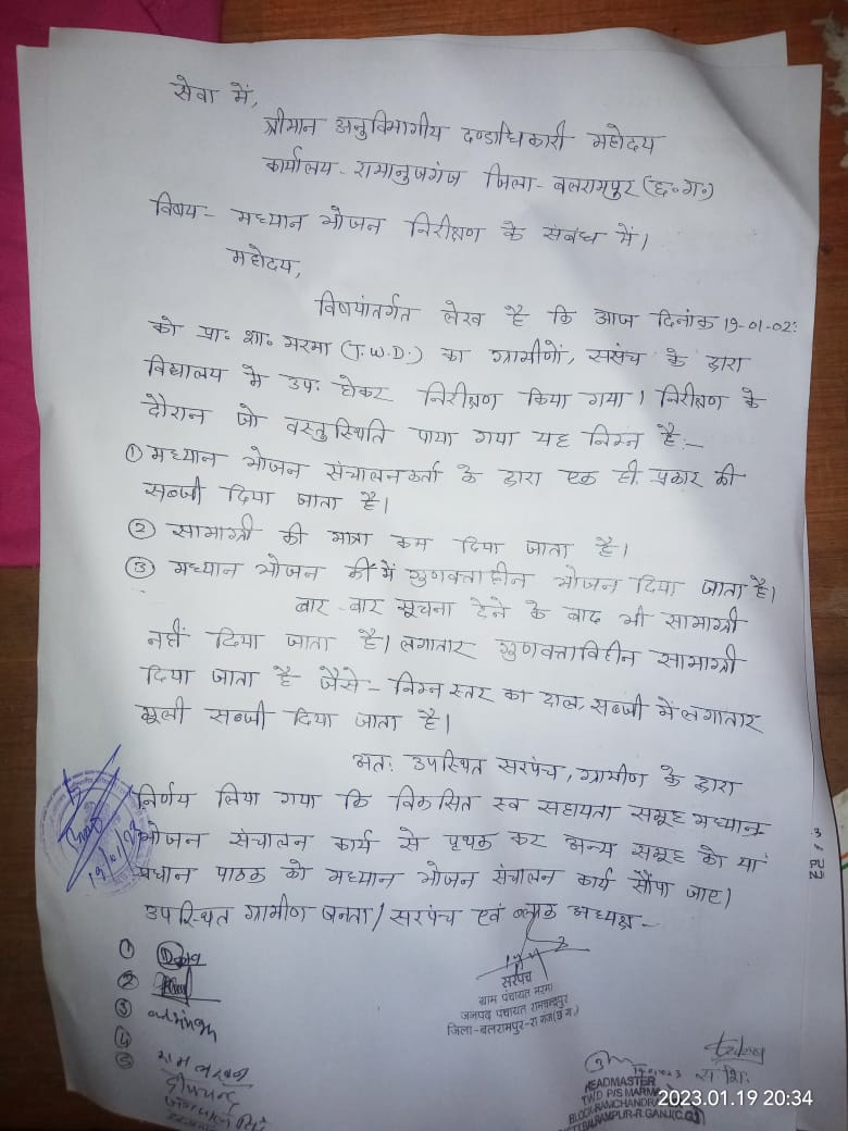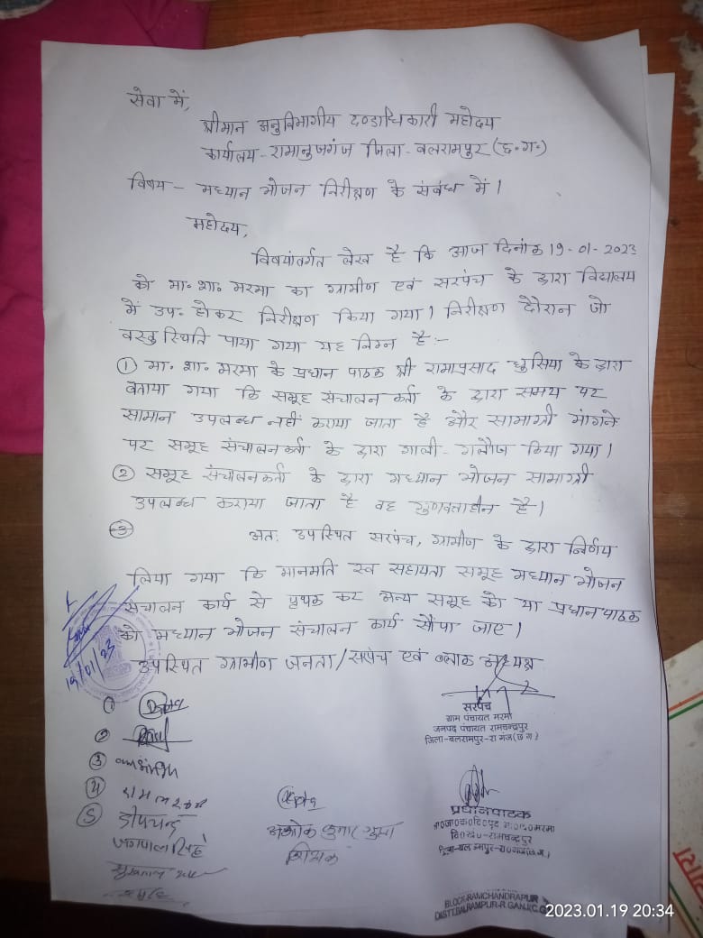 बलरामपुर से(अनिल यादव) बलरामपुर जिला के रामचंद्रपुर विकासखंड के अंतर्गत ग्राम पंचायत मरमा के पूर्व माध्यमिक शाला मरमा (ढोढी़ पारा) तथा प्राथमिक शाला मरमा (ढोढी़ पारा) में ग्राम वासियों के द्वारा मध्यान्ह भोजन का निरीक्षण किया गया जिसमें दोनों समूह संचालकों का घोर लपरवाही पाया गया तथा बहुत ही आश्चर्य की बात है कि बिल्कुल गुणवत्ता हीन मध्यान भोजन का संचालन किया जा रहा है।वहीं माध्यमिक शाला के प्रधान पाठक के द्वारा मुझे जानकारी प्राप्त हुआ कि वह समूह संचालक को उन्होंने सामान लाने का सूचना दिए जिसमें समूह संचालक के द्वारा प्रधान पाठक को अशब्द बोलीं का प्रयोग भी किया गया तथा लगातार केवल चावल दाल सब्जी बच्चे लोग को वितरण किया जा रहा है जिसमें शासन के द्वारा सप्ताह में विभिन्न प्रकार के सब्जी खिलाने का भी नियम जिसमें यहां पर लगातार पुराने आलू तथा मूली का सब्जी बच्चों को खिलाया जा रहा है जिसमें ग्राम वासियों का कहना है की तत्काल समूह संचालक को हटाया जाए तथा दूसरे व्यक्ति को समूह को संचालित करने के लिए दिया जाए तथा जो व्यक्ति समूह का संचालन करेगा वह गुणवत्तापूर्ण मध्यान भोजन चलाएगा अन्यथा उसे भी हटा दिया जाएगा जिसमें सभी ग्राम वासियों तथा प्रधान पाठक भी इस बातों से सहमत है तथा समूह संचालक के खिलाफ आवेदन पत्र लिखकर अनुविभागीय अधिकारी को सौंपा गया है जिसमें जल्द जांच कर कार्यवाही करने का आश्वासन दिया गया हैं।